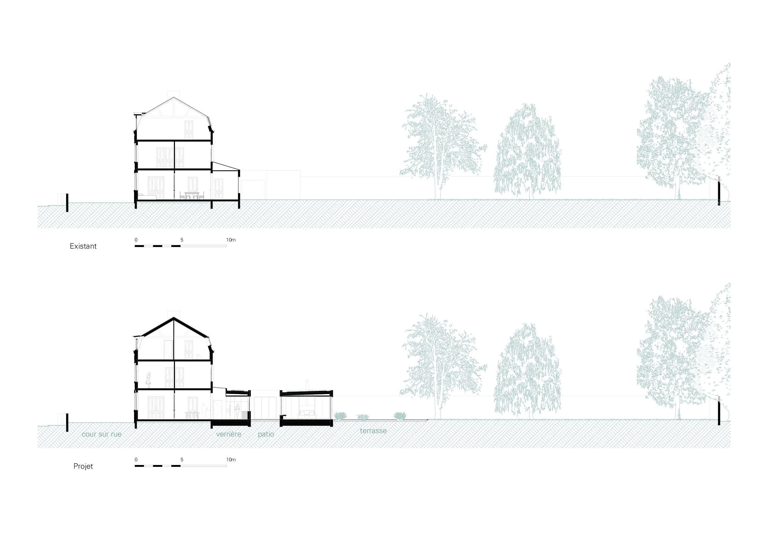 Il est décidé de repositionner le séjour, la cuisine et la salle à manger autour d’un patio dans une extension côté jardin. Le projet cherche à réduire l’effet tunnel en proposant une longue séquence articulée autour d’une verrière, d’un patio et d’une grande baie vitrée panoramique ouvrant sur le jardin. Ce dispositif permet également d’optimiser l’apport de lumière sur l’ensemble du rez-de-chaussée. Chaque pièce bénéficie ainsi d’une relation particulière à l’exterieur (jardin, patio, ciel...).